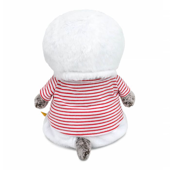 Tal on seljas mahukas lumivalge kohevast karusnahast müts, millel on porgandist nina, tikitud silmad ja naeratus. Müts seotakse valge paelaga, mille otstes on suured tutid.